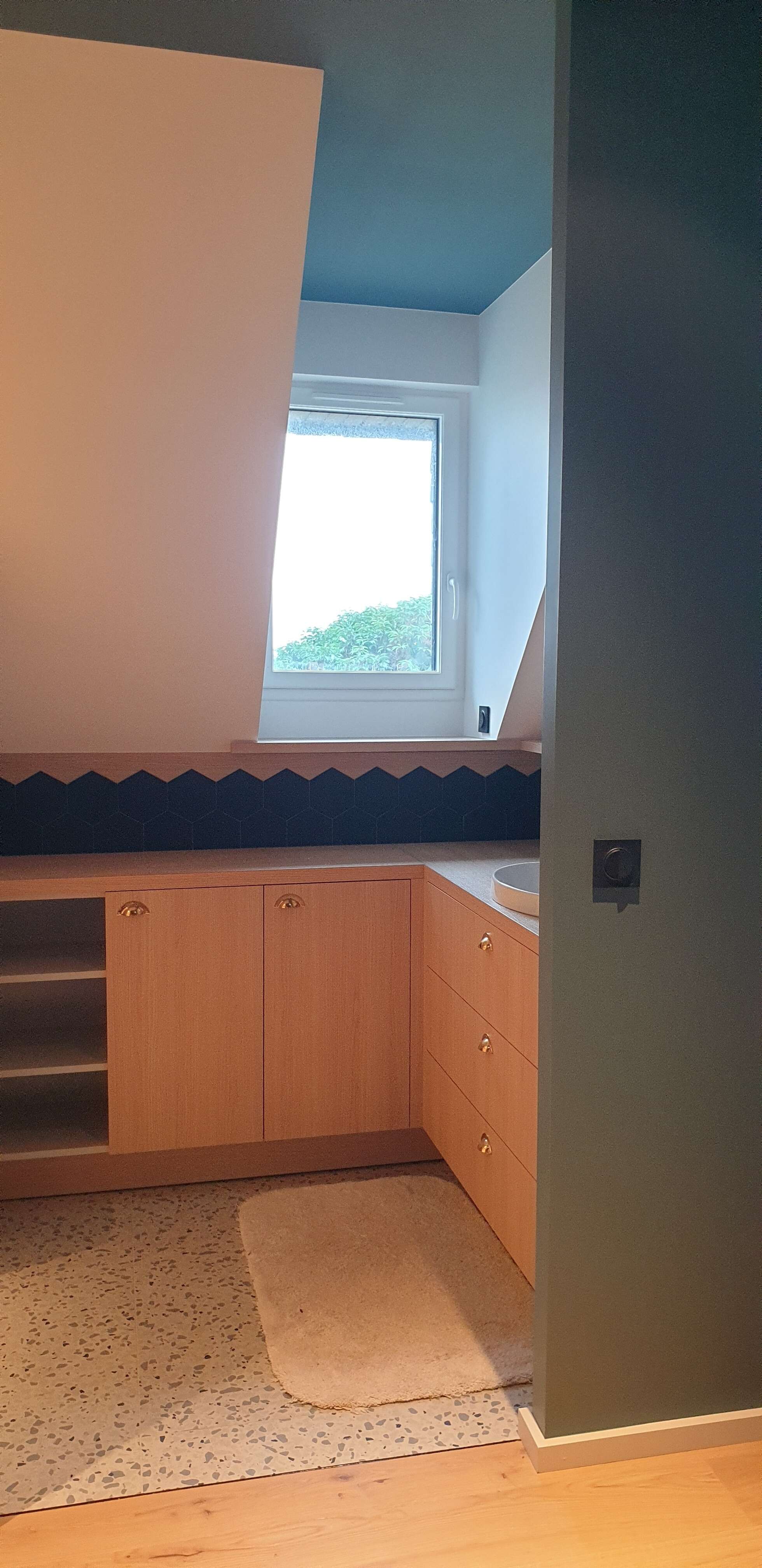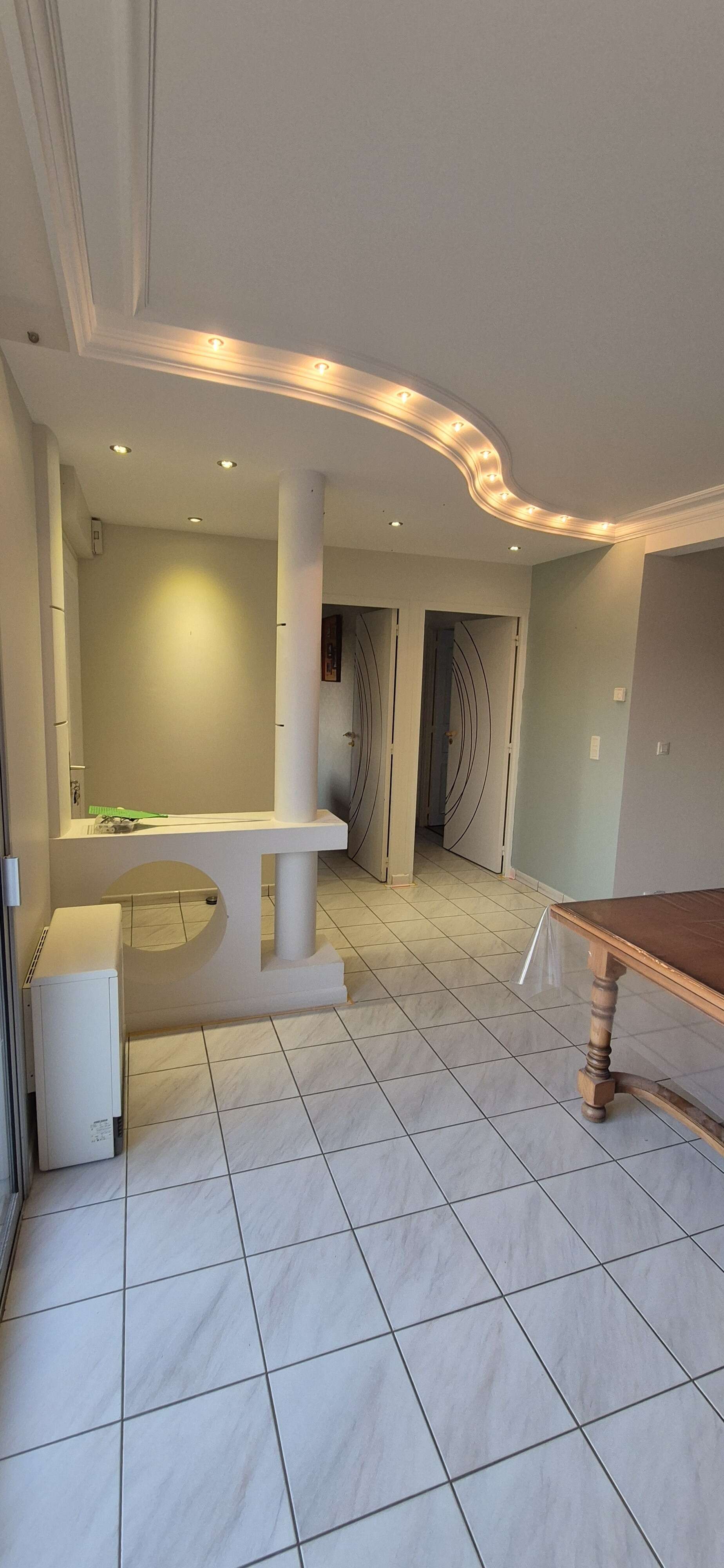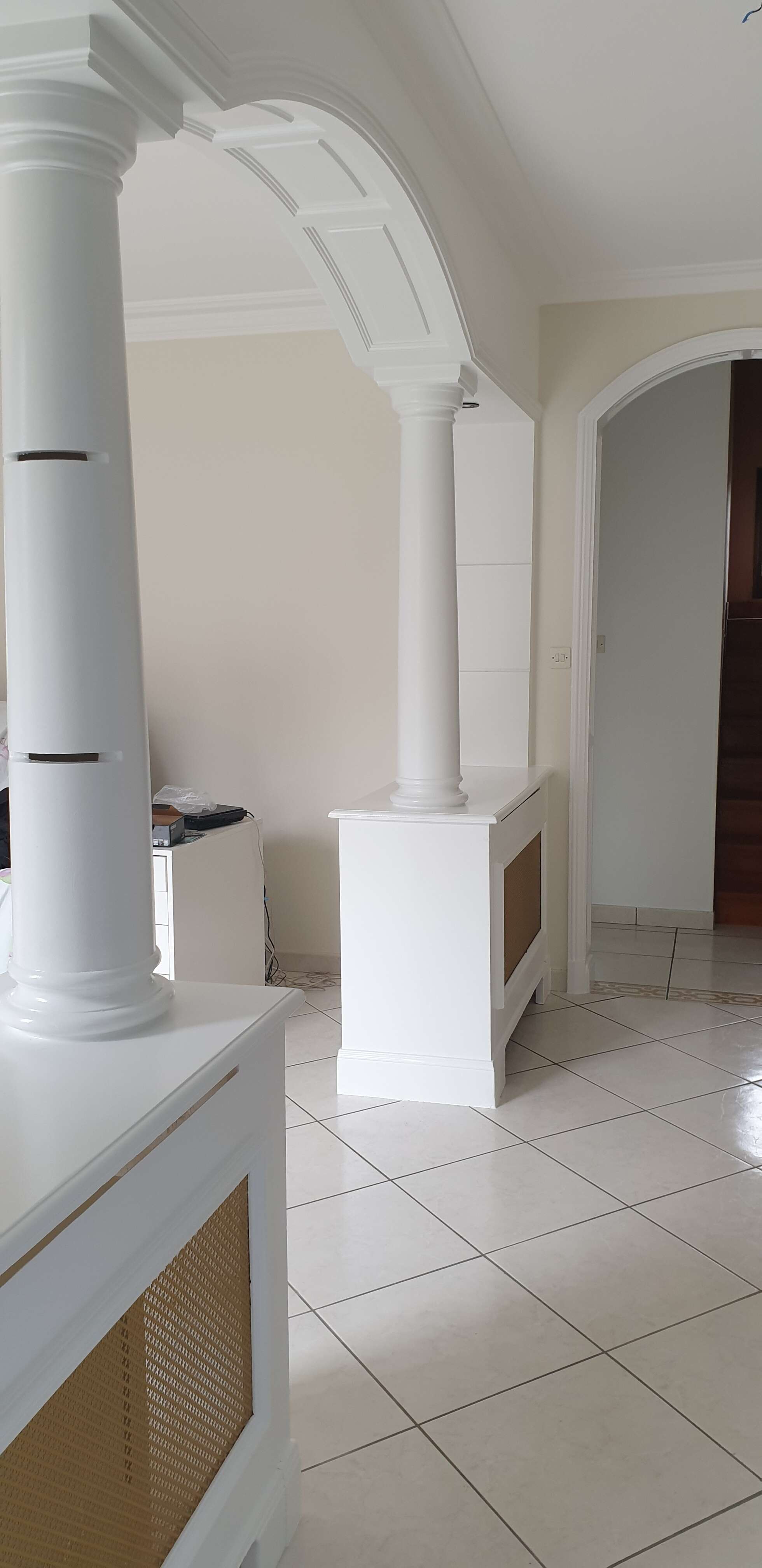 Création de cuisine ouverte sur le séjour, ponçage et vitrification de parquet, installation de faux-plafond et création de plafond décoratif .
